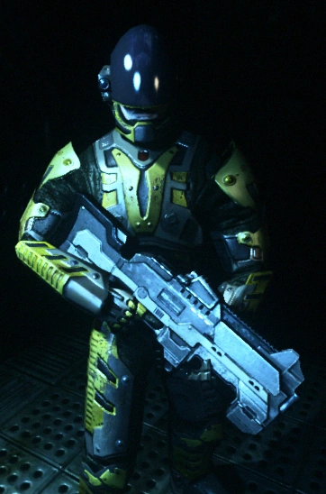 Lysachov was a security guard in Butcher Bay Correctional Facility that was cased in armor including a helmet which only showed his grumbling mouth. He was stationed in the shower area of the guard quarters near Natchios' door. A fellow guard named Lucky, patrolled the area near him.